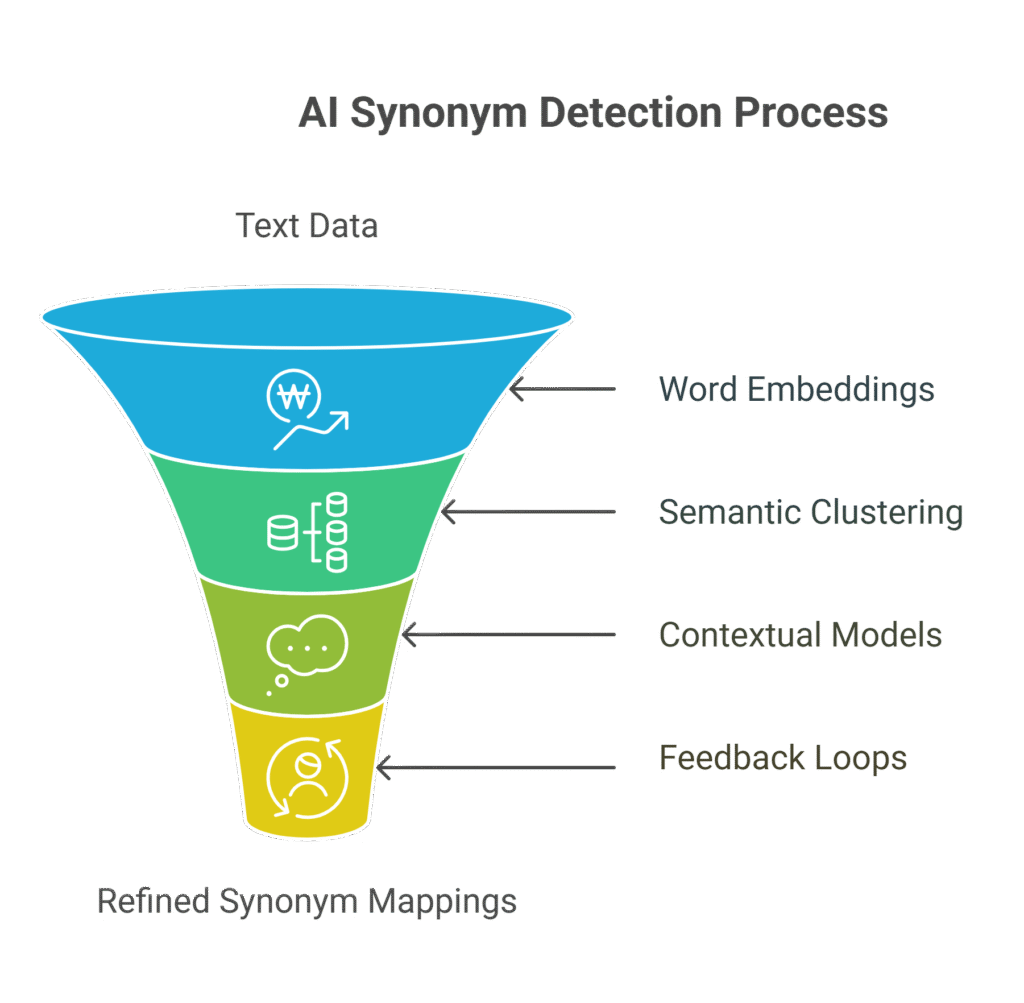 AI synonym detection uses machine learning to auto-identify word pairs based on context and user behavior. Unlike manual mapping, it scales across thousands of terms without manual input.