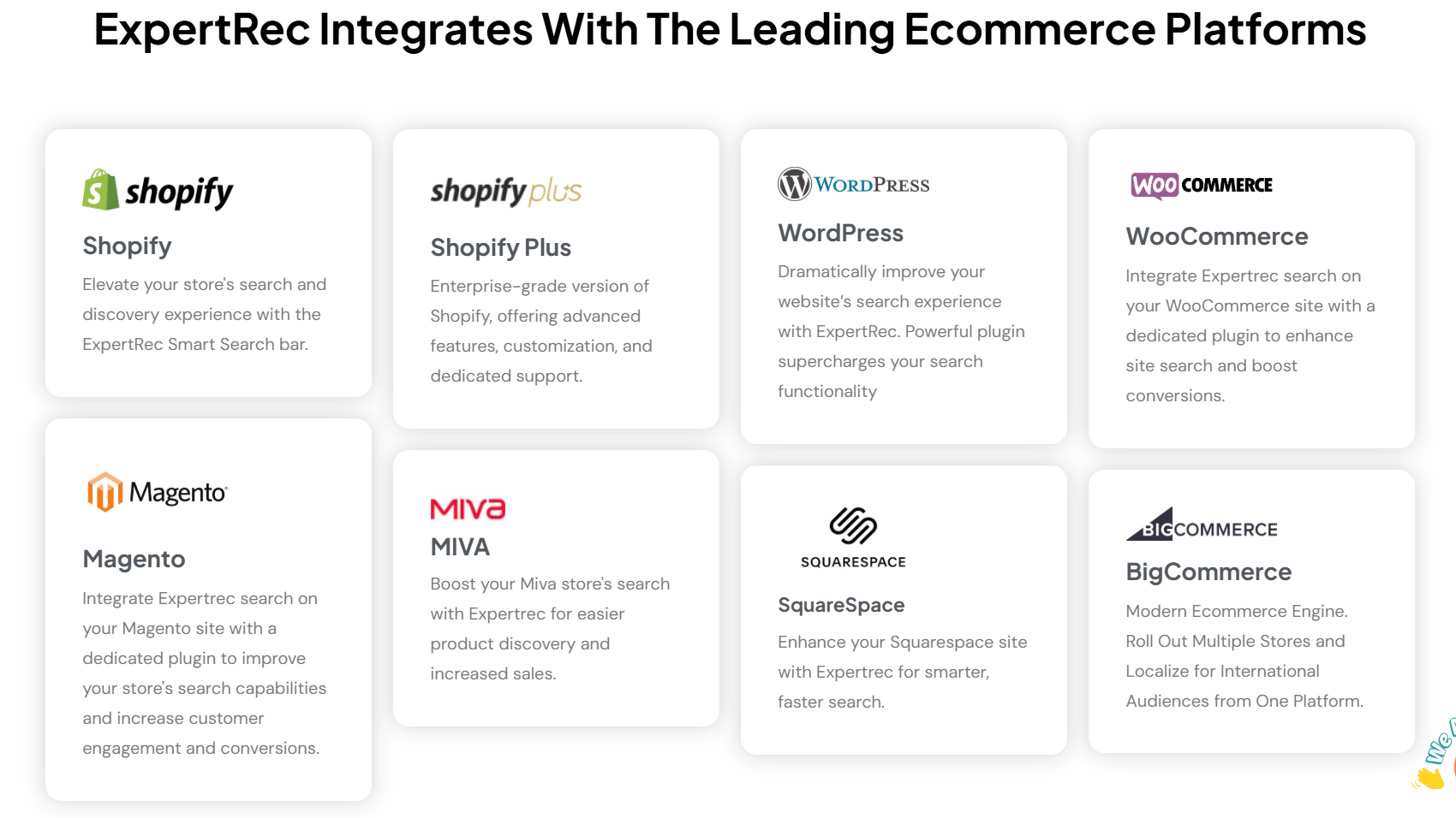 - Seamlessly integrates via plugins or APIs with Shopify, Magento, WooCommerce, Salesforce Commerce Cloud, SAP Commerce, Commercetools, Oracle, and more.
