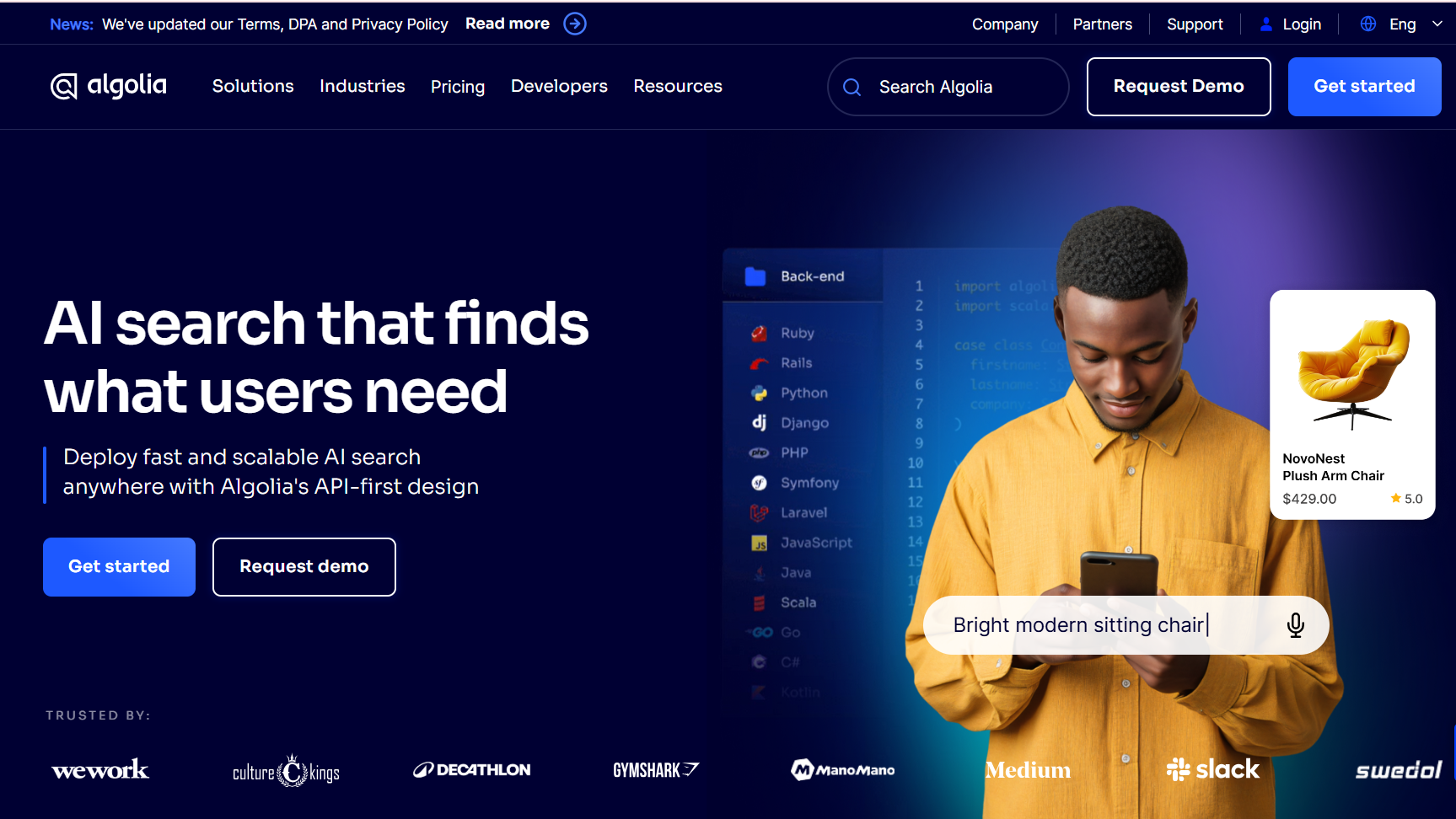 Algolia is a cloud-based, search-as-a-service platform trusted by thousands of global brands. It enables fast search across websites and applications with sub-100ms response times. Its standout capabilities include:
