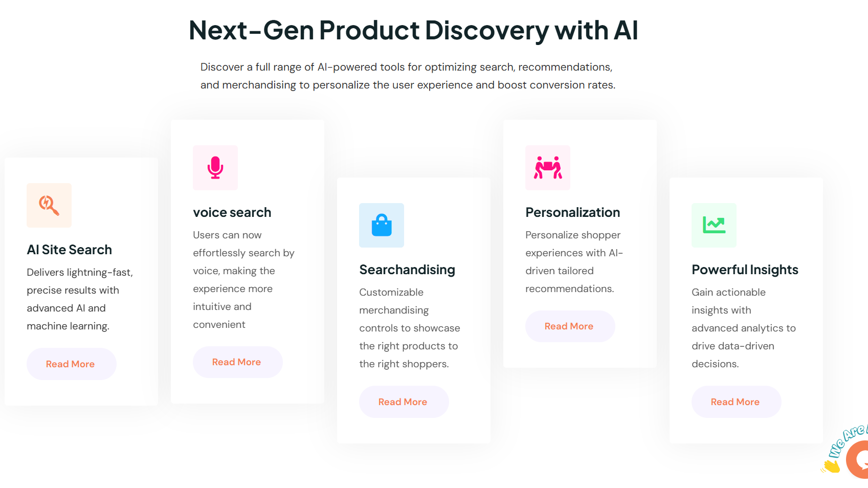 - Offers a ChatGPT-based site assistant trained on your product catalog and site content for conversational search and support.