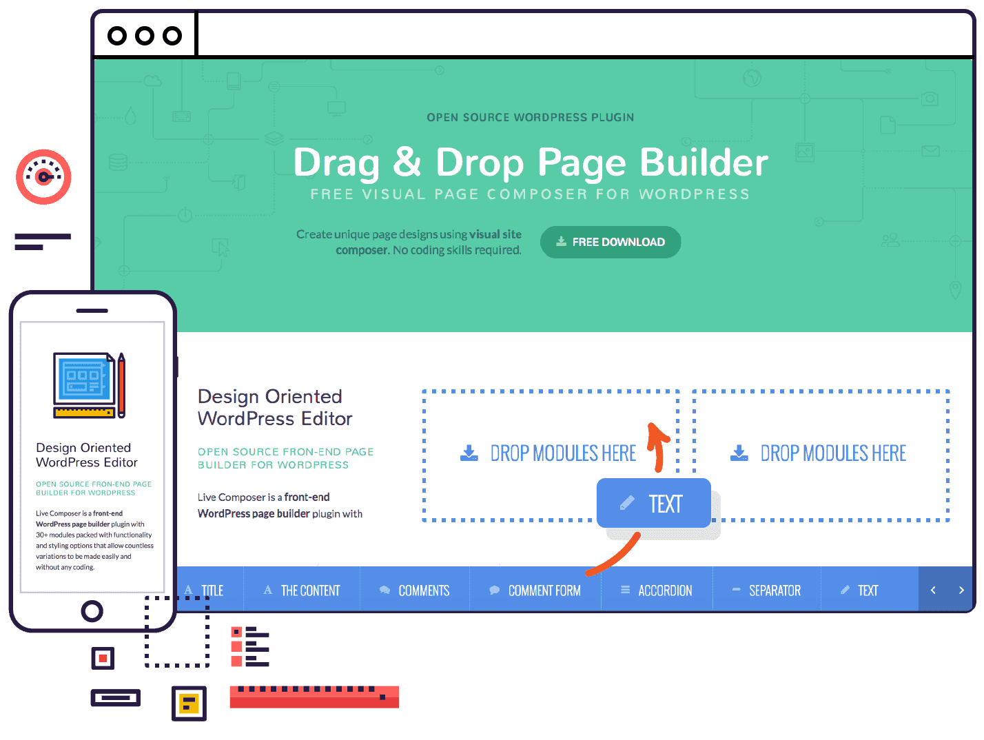 - Live Composer page builder is complete and feature-reach website builder for WordPress. In our page builder, you get most of the features for free paying only for Woo-Commerce support and advanced integrations (ACF, CPT, Mega Menus). Create stunning custom page designs in real-time. Drag & drop front-end editing is a perfectly intuitive way to create and customize great looking websites.