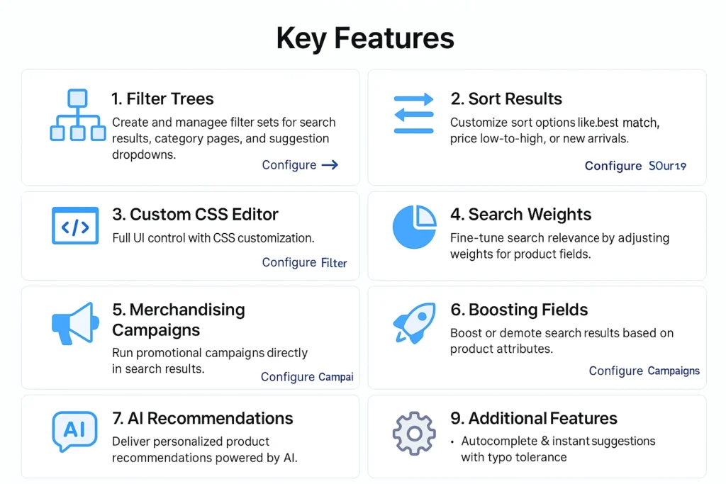 - Track metrics such as zero-result queries, popular searches, CTR, and conversions.