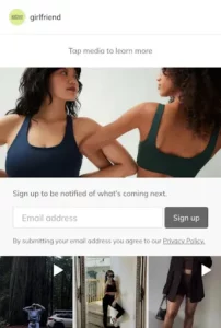 Typically, your call to action will depend on the purpose of your landing page. For instance, if you want email sign-ups, simply saying “Sign up” will do, bearing in mind that the copy should clearly emphasize this prompt. See the example on Girlfriend Collective’s landing page. It not only uses a clear “Sign up” call to action but also adds a contextual layer by including a “Verify Email” step in the user journey, under the pretext of privacy settings for added security and authenticity. This additional verification step is important in maintaining a clean and engaged email list.