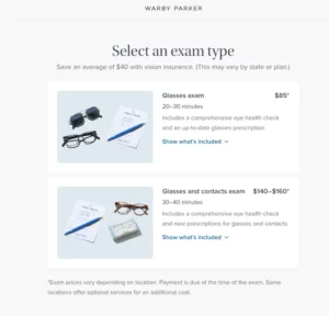 For example, Warby Parker’s SM landing page for booking an eye exam is quite straightforward. You’ll only find relevant information here. See how the design is well-detailed and does not contain unnecessary elements: