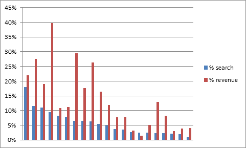 Here is a statistic that illustrates how important a good search app is for your Shopify store’s revenue. It shows the percentage of site users using search and the percentage of site revenue from users who search. As you can see as the percentage of searches increases, the percentage of revenue also increases.
