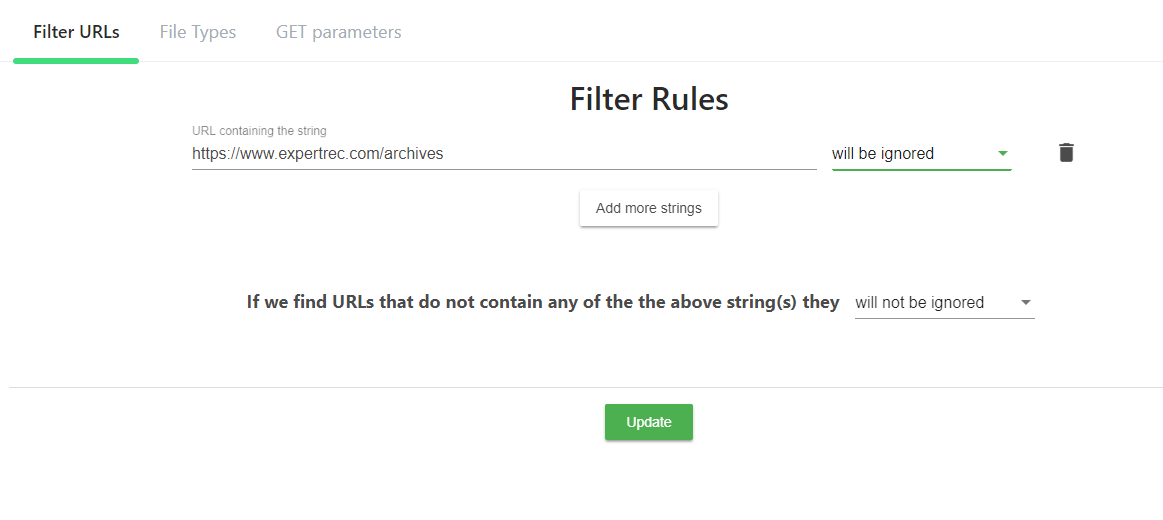 - Under filter URLs-> Enter the URLs or the URL patterns you want to exclude.