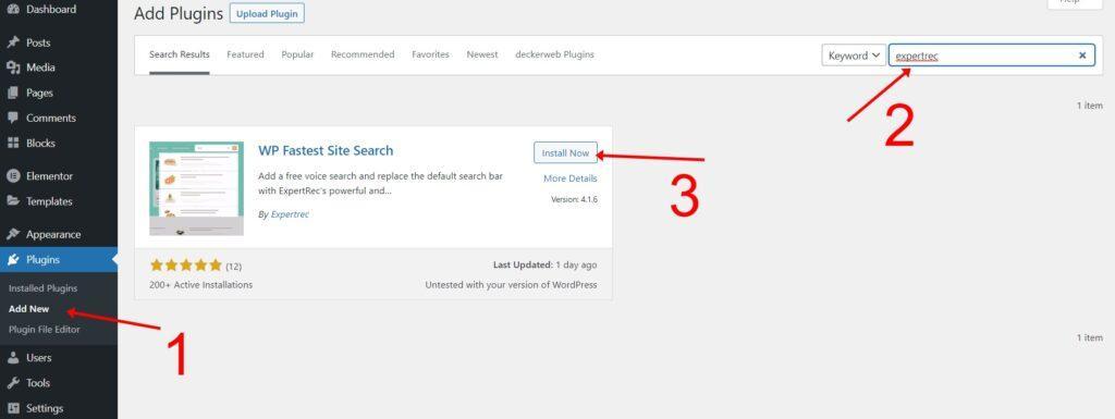 To install this smart and sophisticated WP Fastest Site Search Plugin, log in to your WordPress Website dashboard and scroll down the left bar menu. You need to navigate to Plugin -> Add a new plugin and then search for “Expertrec” or “WP Fastest Site Search” on your WordPress Plugin Search bar.
