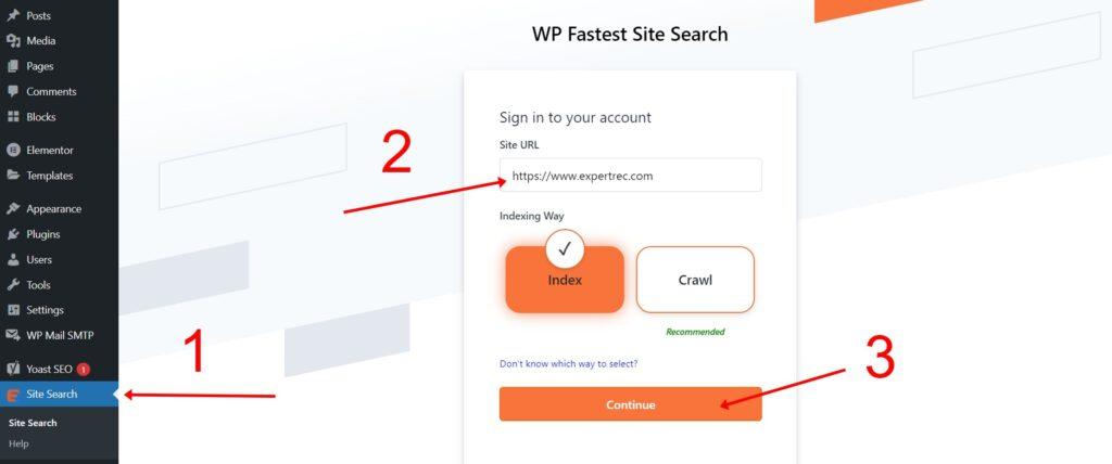 After installing the WP Fastest Site Search from your WordPress dashboard, click through the left side menu, and you will see Site Search (along with an orange E icon.