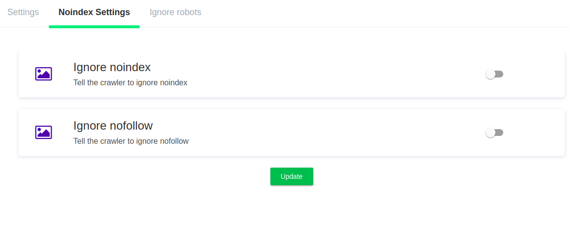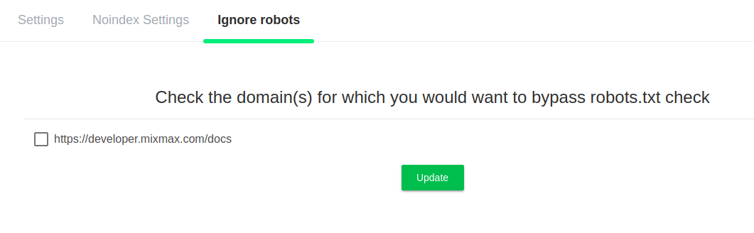 - Ignore robots- If you would like to ignore the settings in your robots.txt you can select the domains you want to enable and update. robots can be found on the URL yourwebsite.com/robots.txt