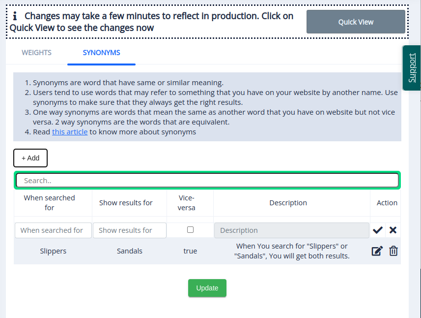 After adding the synonyms, click on Update to save the changes. Changes may take up to 3 hours to reflect on your store.