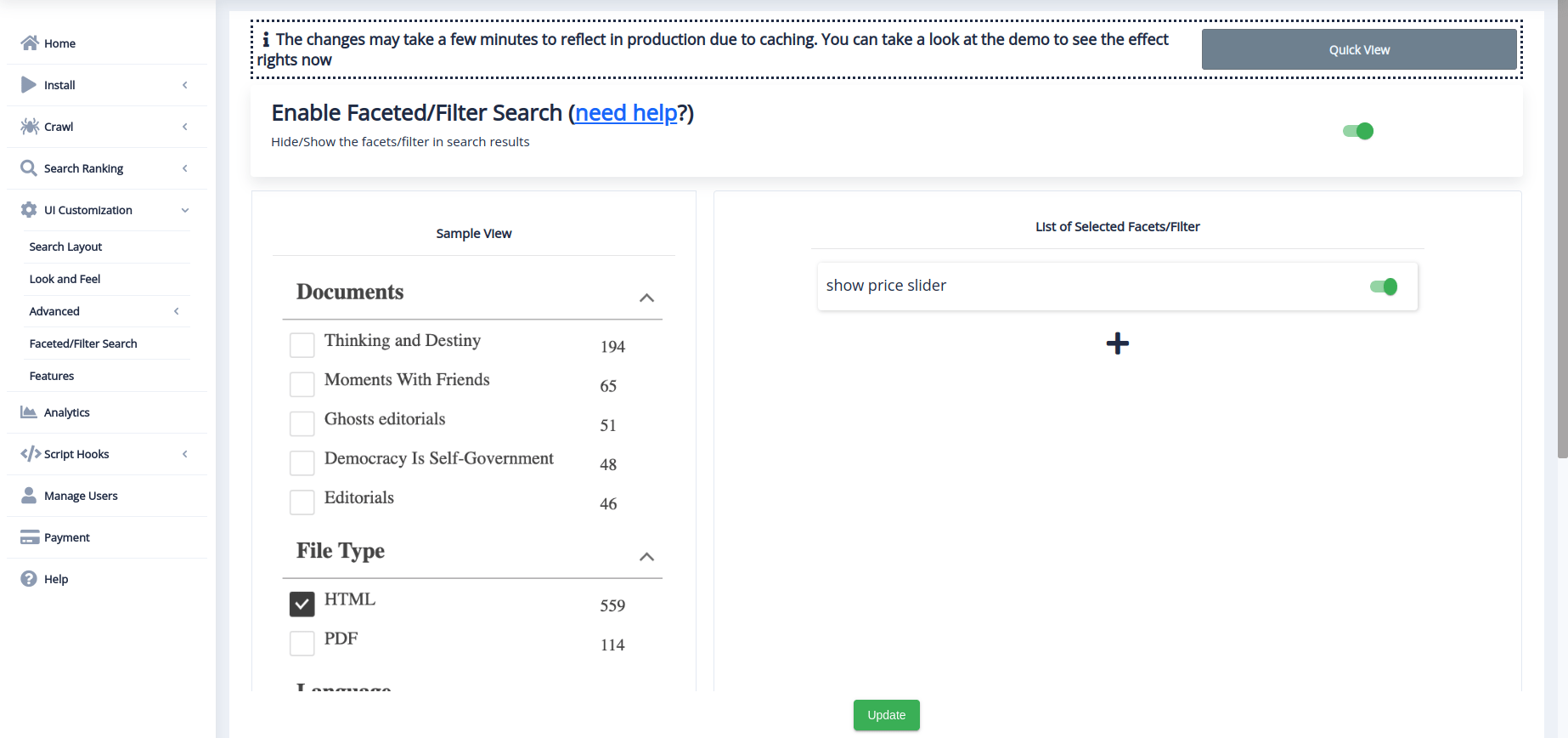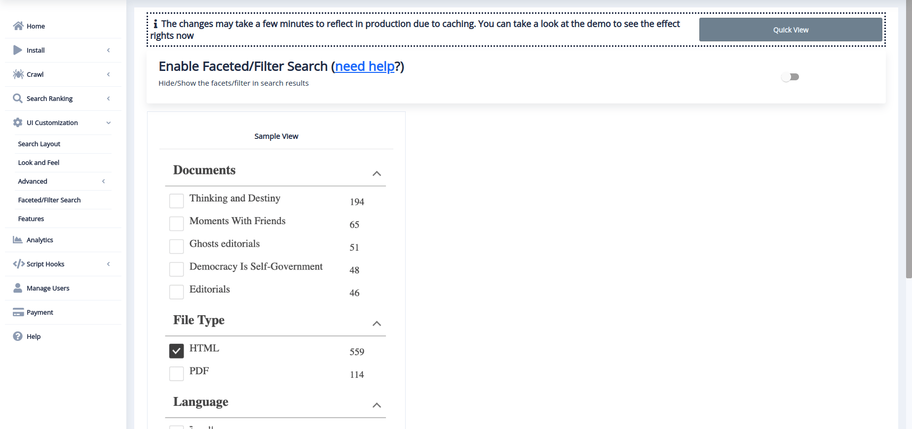 To enable this feature, toggle the Enable Faceted/Filter Search Switch under UI Customization > Faceted/Filter Search section from the Expertrec Control Panel.