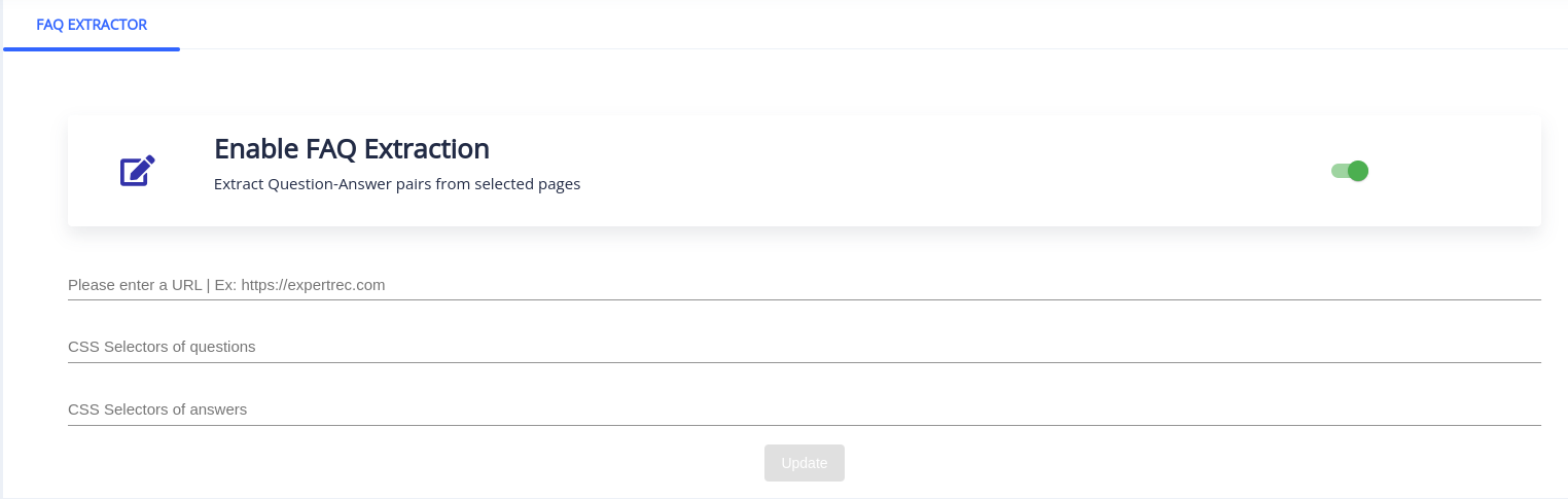 Enter the URL of the FAQ page in the first input field, followed by the CSS selectors of the question and answers in the respective fields. Click on Update to save the changes.