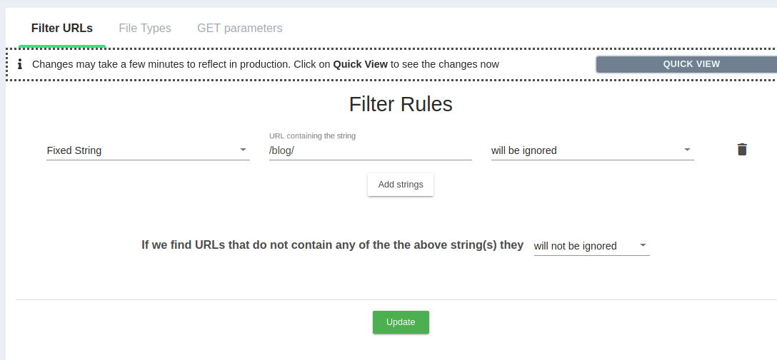All URLs containing the string ‘blog’ will be ignored from the search. You can make custom patterns using regex as well.