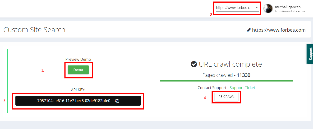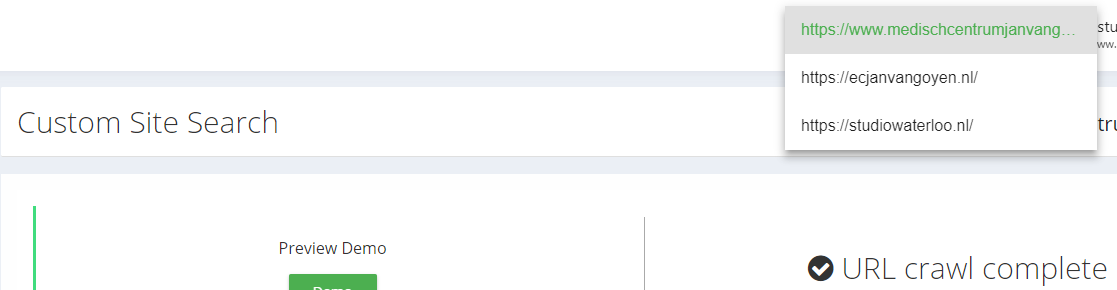 Use the demo to preview your customizations before taking the search live. If in case you have multiple websites you can use the drop-down button to toggle between multiple websites as shown as in the snapshot below.