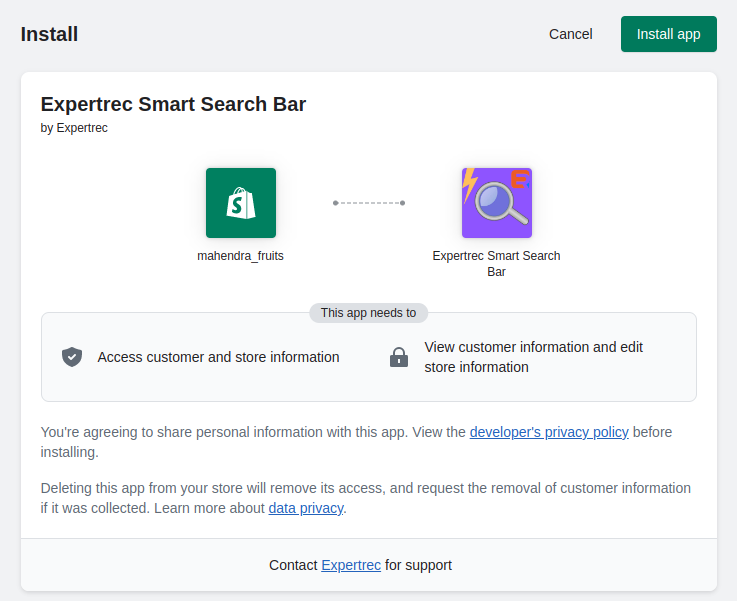Follow the instructions to install the Expertrec Smart Search Bar into your Shopify store