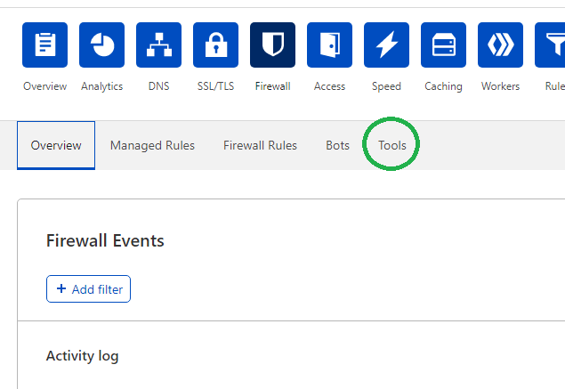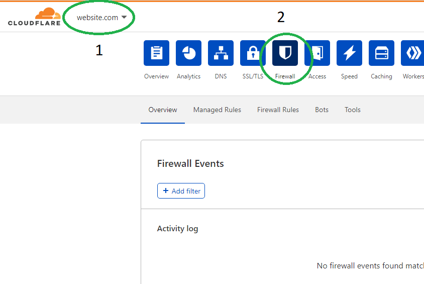 Step 1: Log in to your Cloudflare account, select the website that you are working on, and navigate to the ‘Firewall’ Menu on the Cloudflare dashboard.