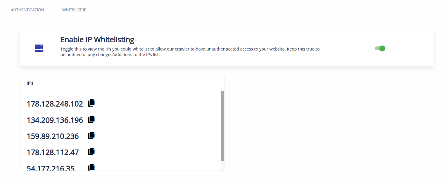 Step 3: Get ExpertRec Bot’s IP Address by following this link (login to your Expertrec account if session expired) and toggle ‘Enable IP Whitelisting’. This will display a list of IPs you could whitelist to allow our crawler to have uninterrupted access to your Cloudflare connected website. Keep this option turned to be notified of any changes/additions to the IPs list.