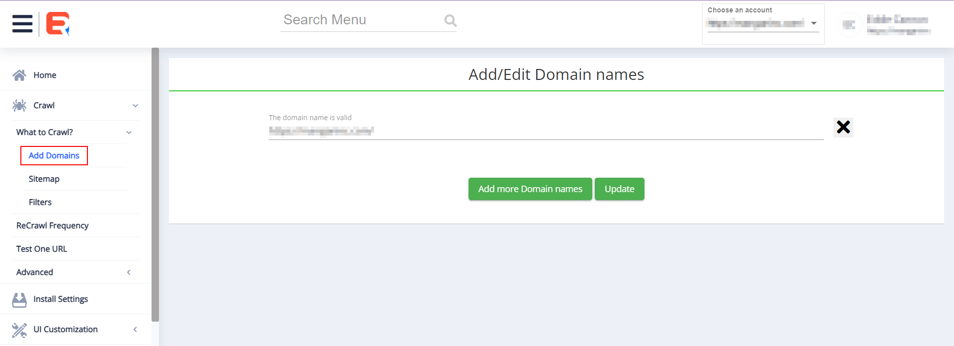Here you can add or edit the website domains or URLs you want to crawl. You can also delete the existing URLs and crawl a new URL (This requires assistance from support). Please note that you can edit your URL more than once only if you are on a paid plan. Free account users and demo accounts can only change their URL once.