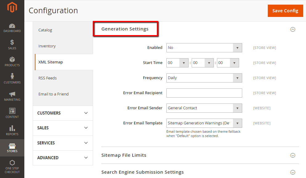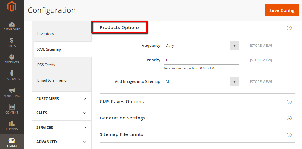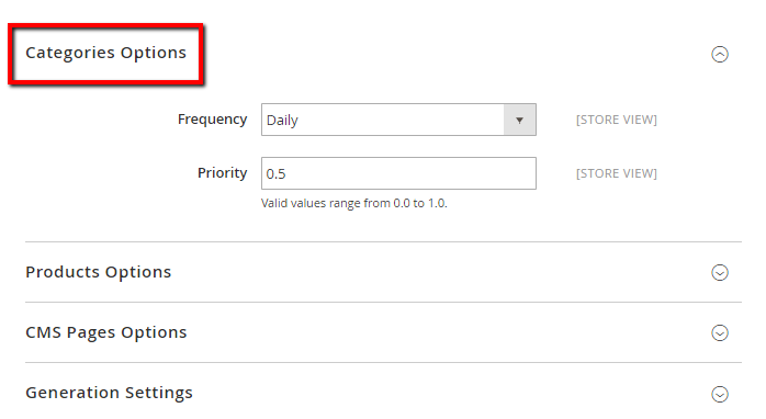 - Go to Admin panel ->Stores->Settings->configuration->catalog->XML sitemap->Categories options