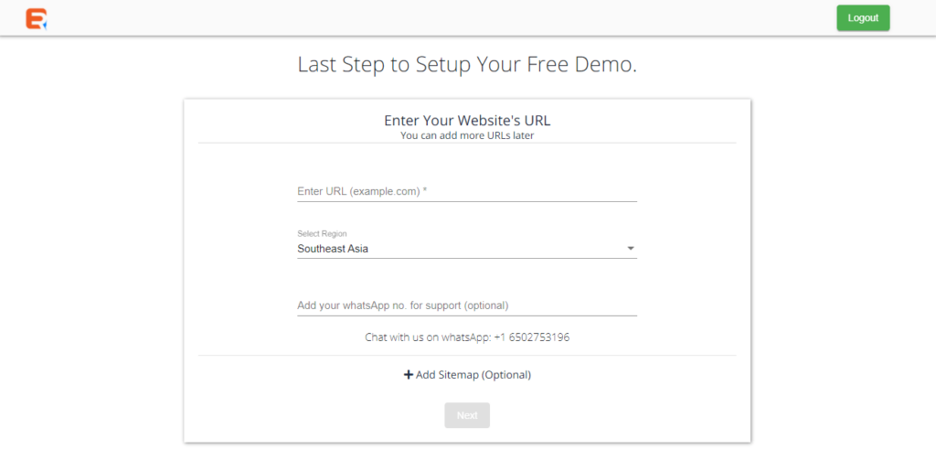 - Sign up with your email ID. After signing up you will be greeted with a similar page. Of course, you get a demo before trying! that’s what friends do for each other. You will need to enter your online store’s URL, the closest region to you. It is better if you add your WhatsApp number. It makes getting customer support very easy if do not have one, it is alright we kept it optional for a reason. Then you can add the sitemap, if you do not that is fine too it will be auto-detected.