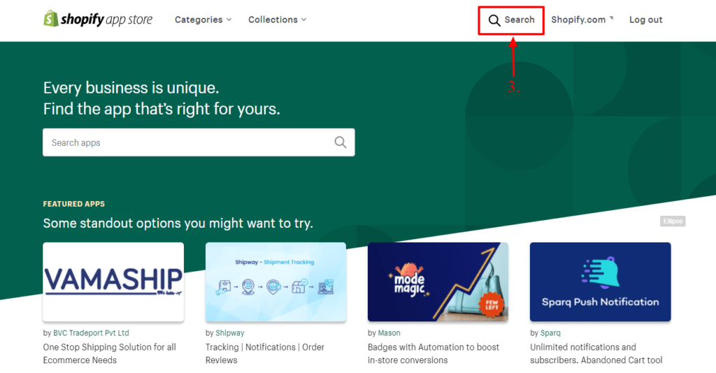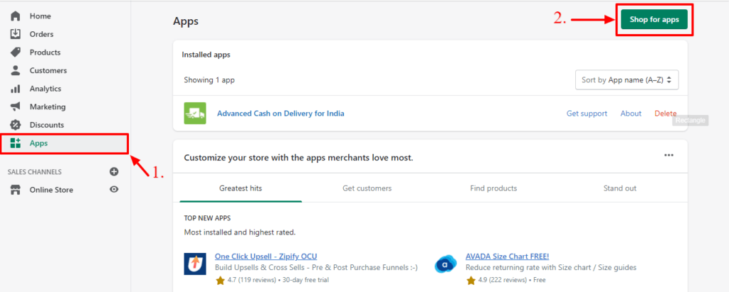 - You will need to search the app through the Shopify App store. Click on the “Shop for apps” button.
