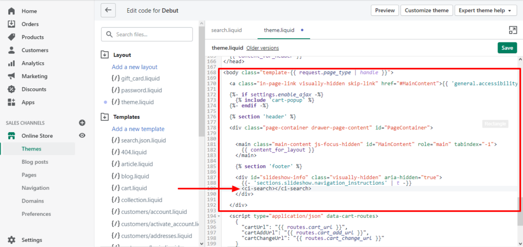 - Now for the search bar to work you have to paste a code snippet under the body tag. Please refer to the image below.