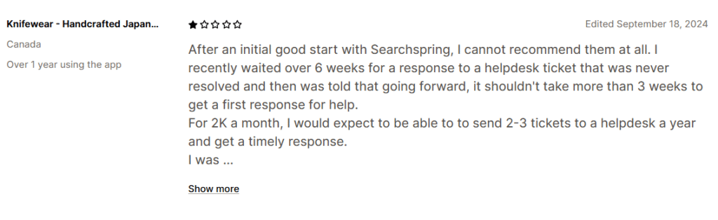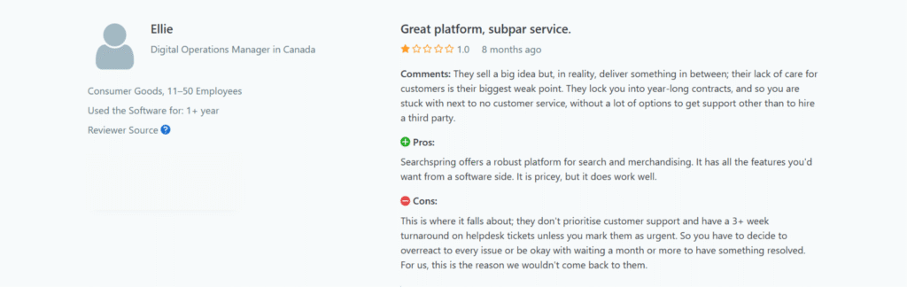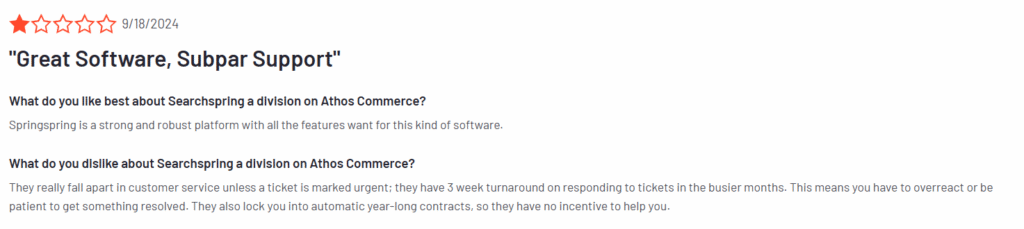 Searchspring is well-known in the eCommerce space, and user reviews on platforms like G2 and Capterra often mention its robust merchandising tools and hands-on support. However, many users also point out limitations that may not make it the right fit for every business—especially smaller or fast-moving teams.