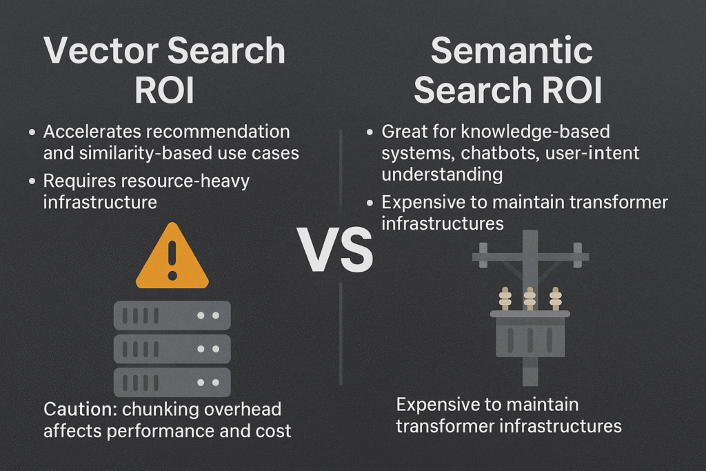 Semantic search delivers strong ROI in knowledge management, chatbots, and user intent understanding. It enables natural language relevance but requires maintaining expensive transformer-based infrastructure. Best suited for language-rich environments, though ongoing operational costs can be significant.