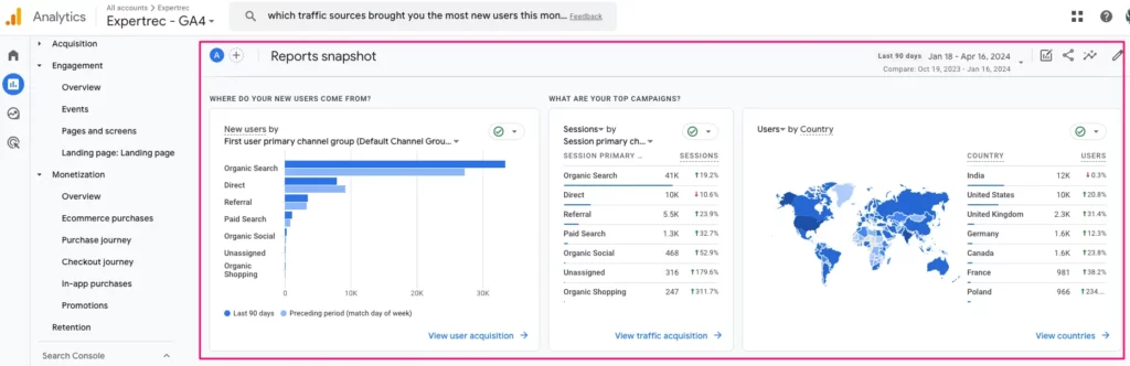 - Traffic sources – GA tracks where visitors originate from, whether it be search engines, referring sites, social media, or direct entry. The source and medium are recorded.