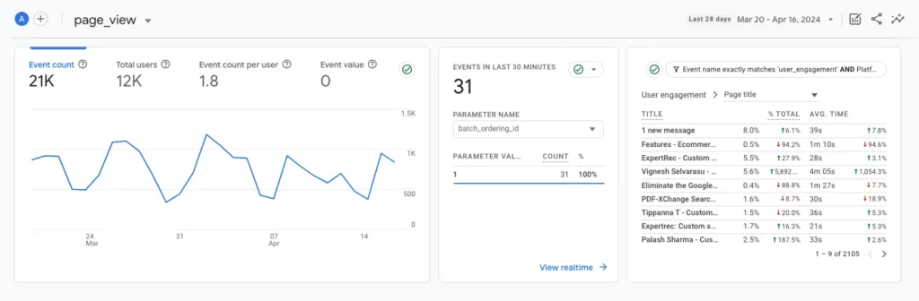 - Page visits – GA records every page visit on a site along with the URL, page title, and time spent on the page. This provides insights into content engagement and site navigation patterns.