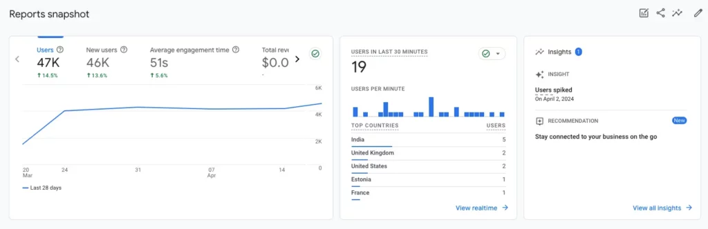 - Interactions – Clicks, downloads, signups, purchases, and other interactions are all tracked by GA. This shows how users engage with site content and conversion points.