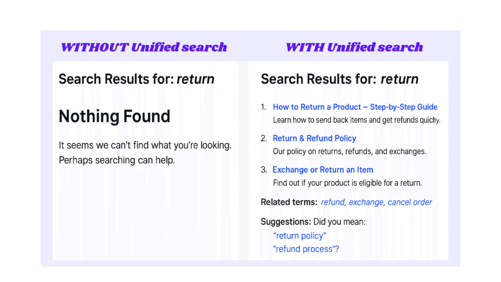 Customers shouldn’t need to know where content lives. This search method ensures they find the right information, whether it’s in a product description or a support page. - Fewer “No Results” Pages