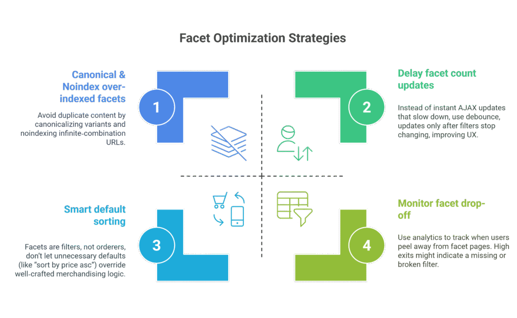 High-converting facets (e.g., “Men’s blue running shoes size 10”) can double as SEO landing pages. Create optimized titles, meta descriptions, and rich schema to rank them. - Lower Bounce, Higher Relevance