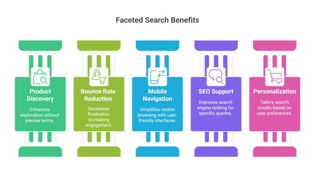 Faceted search empowers users to filter products by attributes like size, color, price, brand, and more, turning chaotic browsing into purposeful discovery.