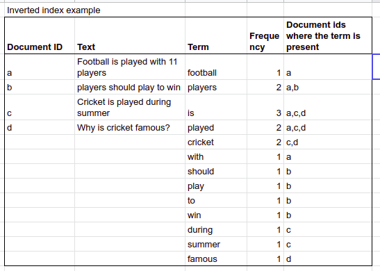 In an inverted index, each indexed term points to a list of documents that contain the term. Here is an example that shows how a inverted index looks like.