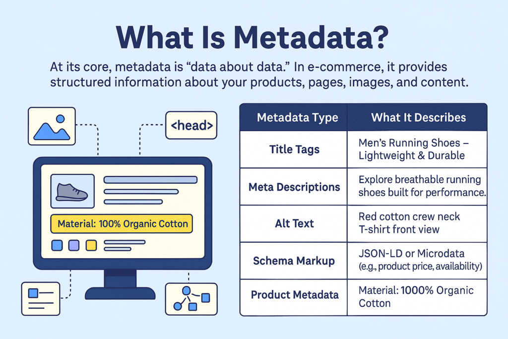 At its core, meta data is “data about data.” In e‑commerce, it provides structured information about your products, pages, images, and content. Think of it as the DNA of your online store, hidden from users, but essential for machines like search engines and AI systems to understand what you’re selling.
