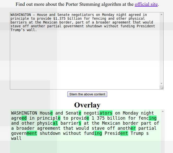 - Porter Stemmer- You can experience the porter stemmer from here. http://9ol.es/porter_js_demo.html