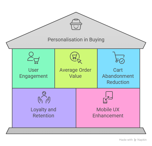 By remembering preferences and offering reminders or incentives, personalisation helps bring users back to complete their purchase.