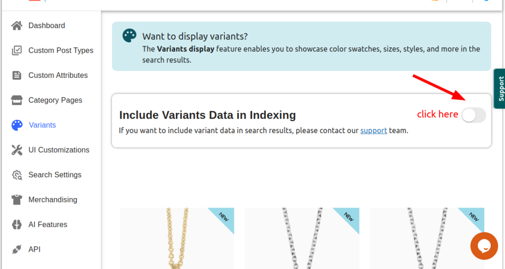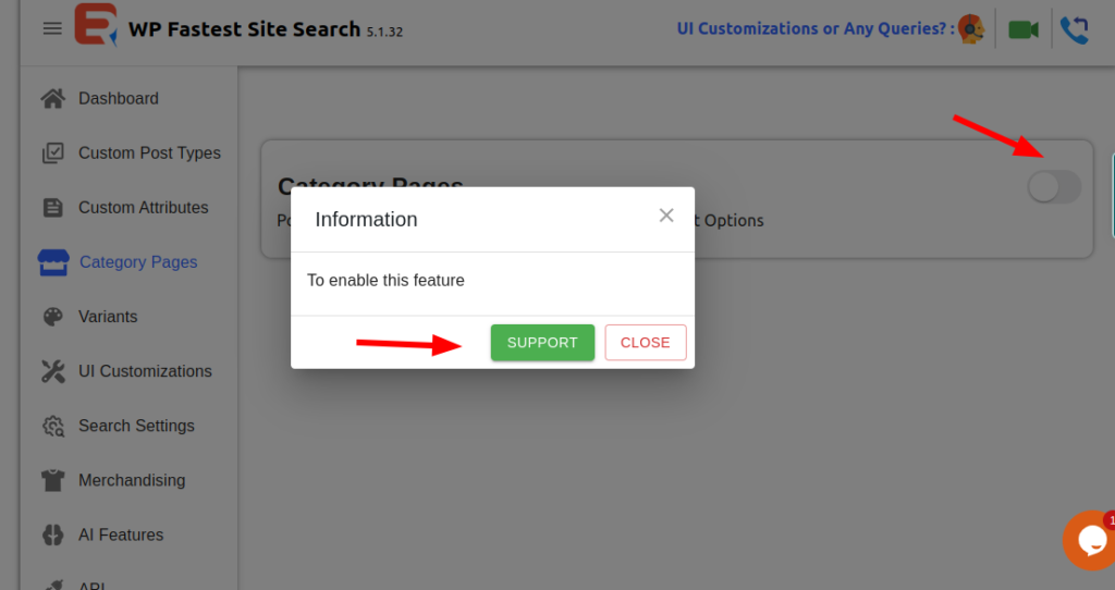 For wooactive users along with variants one more feature willbe there that is category page . If you want to show category in the filter in search result page then you can enable this option . If you dont have this option enabled you need to contact support team . Click on the toggle button and a modal will open . There you will see support button . If you click on the button it will navigate you to the support desk . There you can raise a ticket for it.