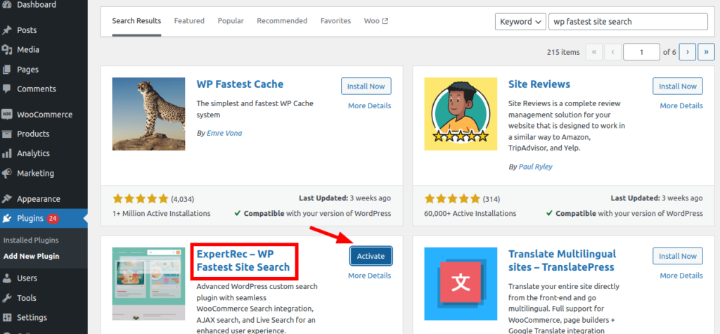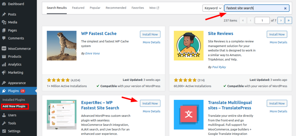 Go to WordPress admin panel and click on add new plugin. There will be a search bar in the right top side. Search by plugin name WP Fastest Site Search and install it.