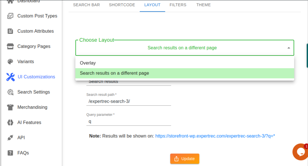 You can choose how you want your search page to be appeared. If you want your search page in a different page then choose search result on different page option from dropdown or if you want in same page then choose overlay. You can also customize the search page title, search query variable and search result path from the plugin . After customization click on update button to reflect your changes in your site.