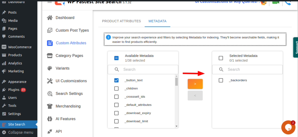 if you click on custom attribute tab you will see two options. You can Improve your search experience and filters by selecting Product Attributes and metadata for indexing.