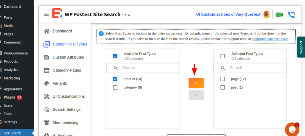 After selecting from available post types click on right arrow to update the selected post types.