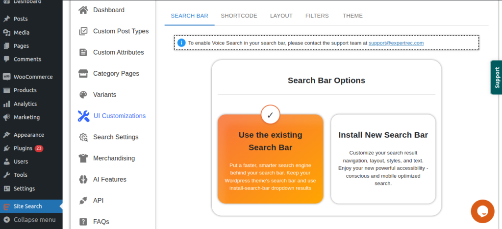 - If you want a new search bar in your site with our plugin search integrated you can choose Install new search bar option.