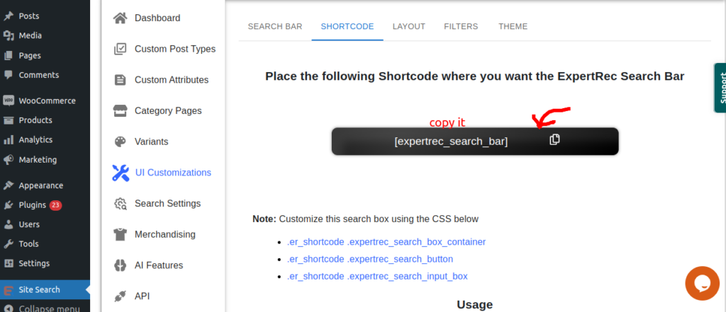 A shortcode is a small piece of code that allows you to embed dynamic content or functionality into your pages or templates. If you want to change position of your search bar and want to customize the CSS you can copy the shortcode and place it where you want your search bar to appear.