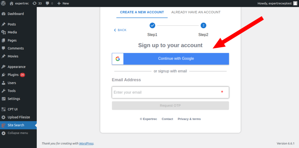 After clicking on continue button you will be landed on step 2 and a new form will appear . Here you will have 2 options for signup. One is through google and other is otp based authentication. You can choose any of the way.
